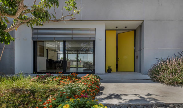 בית חד קומתי בסגנון אורבאני עם גג שטוח, קיר חזית מלוחות בטון חשוף, פרגולת פלדה, חלל ציבורי מרשים ופלטת צבעים מיוחדת במינה.