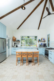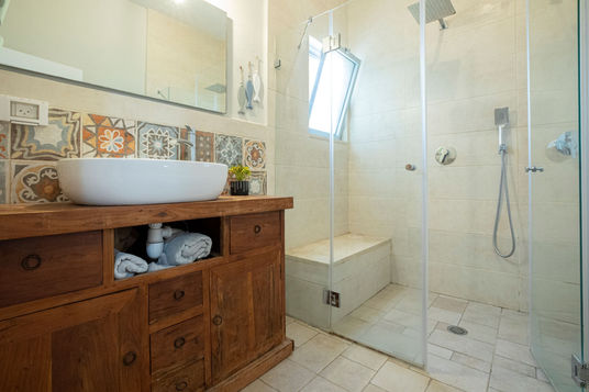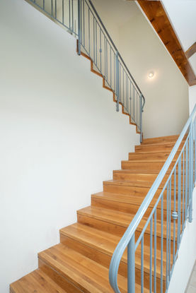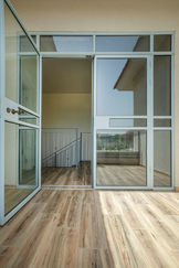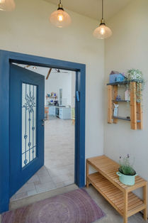 בית דו קומתי בעל גג רעפים רב שיפועי, גרם מדרגות בנוי מחופה עץ, קורות עץ חשופות וסלון רחב ידיים המשקיף דרך וויתרינות תכולות אל שדות העמק.
